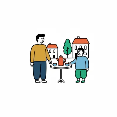 Ein Erwachsener und ein Kind am Tisch mit einer Kaffeekanne im Freien.
