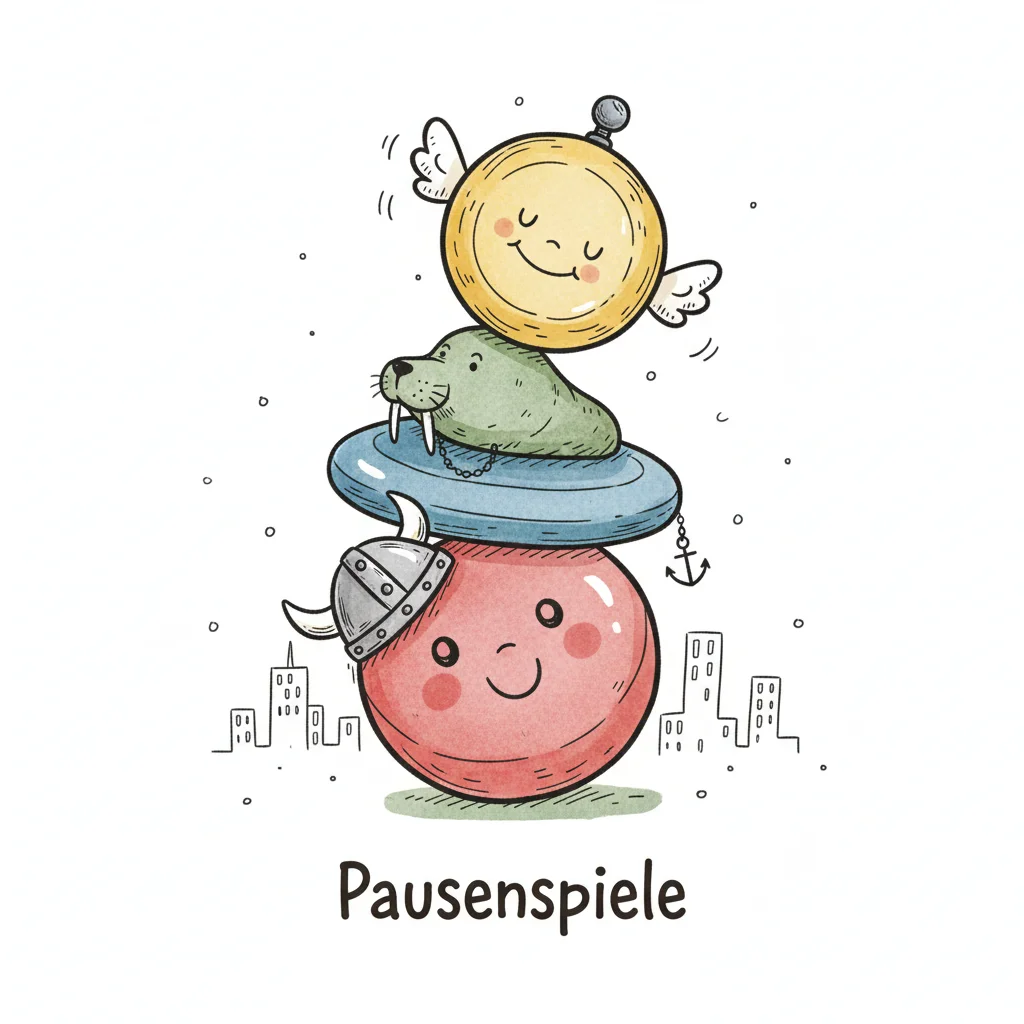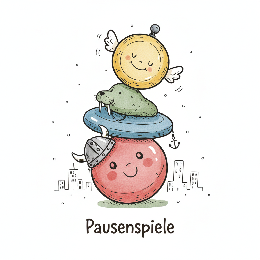 Drei gestapelte, lächelnde Cartoon-Figuren: ein Wikinger, ein Walross und ein geflügeltes Wesen. "Pausenspiele".