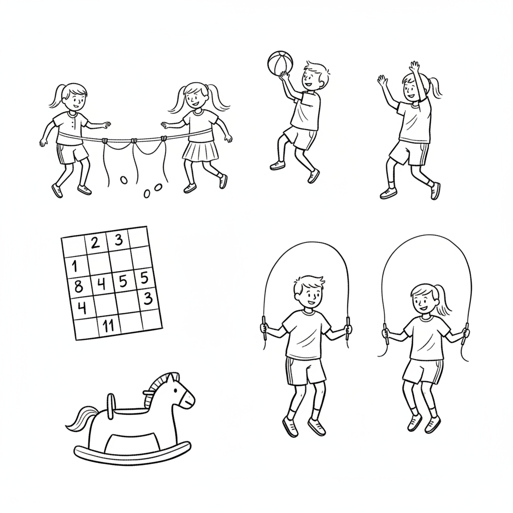 Kinder spielen verschiedene Outdoor- und Indoor-Spiele: Limbo, Ball, Seilspringen, Zahlengitter, Schaukelpferd.