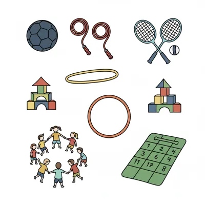 Verschiedene Spielzeuge und Spiele für Kinder, darunter Ball, Seile, Bausteine und spielende Kinder.