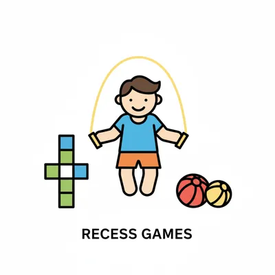 Kind springt Seil, umgeben von Spielgeräten wie Hüpfkästchen und Bällen. Thema: Pausenspiele.
