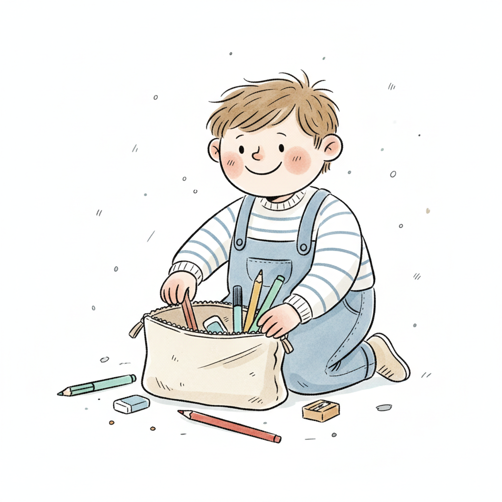Handgezeichnete Kinderbuchillustration im modernen skandinavisch-nordischen Stil. Minimalistische, freundliche mit einfachen Formen und leicht unregelmäßigen, handgezeichneten Linien. Ruhige, gedeckte Farbpalette, viel freie Fläche, reduzierte Details, sanfte Papier- oder Aquarellstruktur. Warme, ruhige, leicht humorvolle Stimmung, flächige Komposition ohne starke Perspektive, moderner nordischer Illustrationsstil, charmant und zeitlos. Hoher Kontrast, isoliert auf weißem Hintergrund. WICHTIG: KEIN TEXT im Bild. Hintergrund: Rein weiß.
