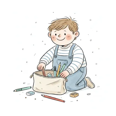 Ein lächelndes Kind kniet und sortiert Buntstifte und Marker in einem Mäppchen.