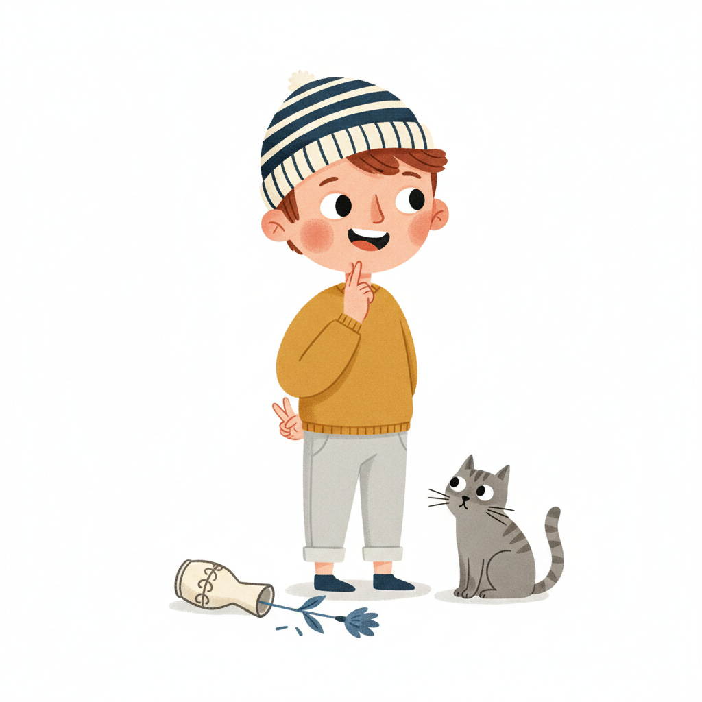 Junge mit Katze und umgefallener Vase. Er lächelt unschuldig, macht aber ein Peace-Zeichen hinterm Rücken.