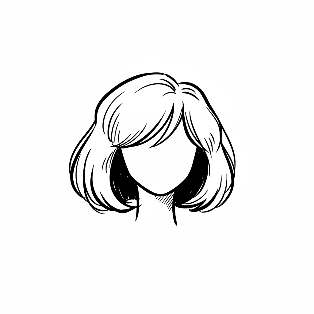 Schwarz-weiße Skizze einer Person mit Bob-Frisur und leerem Gesicht.