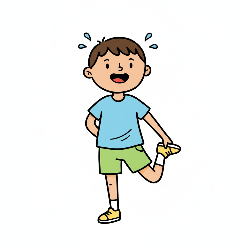 Ein Cartoon-Junge dehnt sich mit einem Lächeln und Schweißperlen beim Sport.