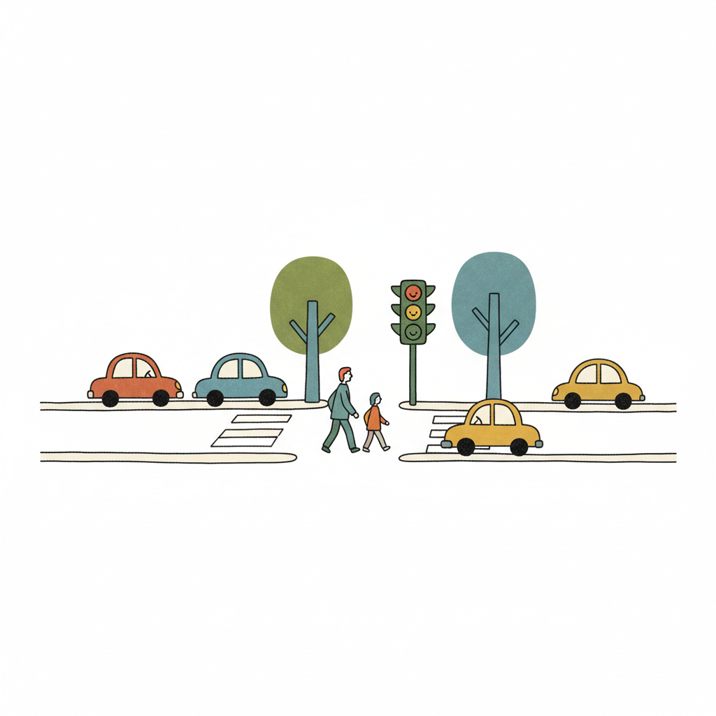 Zwei Personen überqueren eine Straße bei Ampel, umgeben von Autos und Bäumen.
