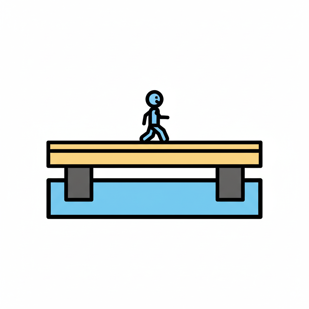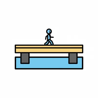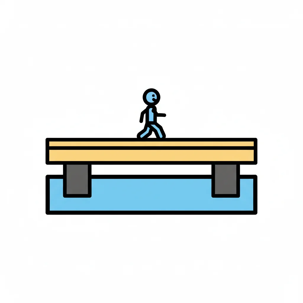 Ein Strichmännchen geht über eine gelbe Plattform, die von grauen Pfeilern über blauem Wasser getragen wird.