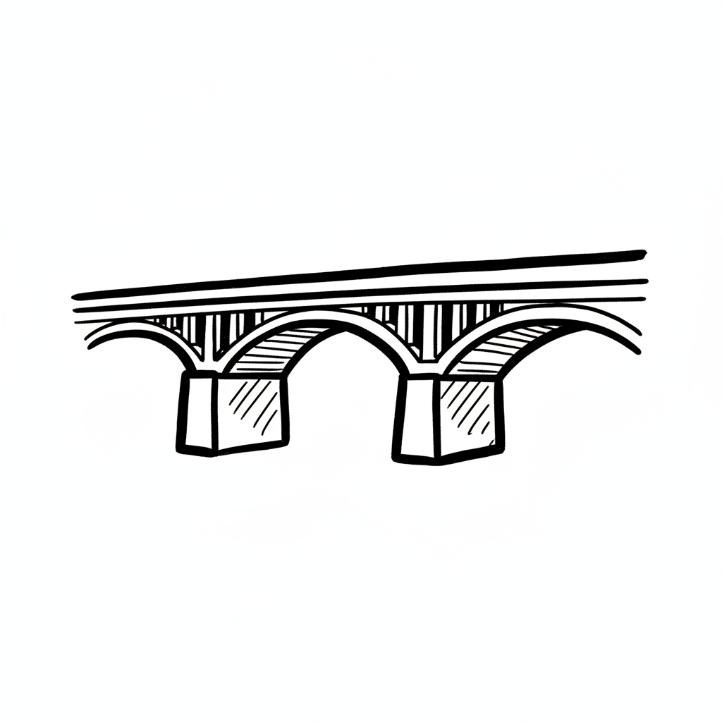 Schwarz-weiße Strichzeichnung einer Bogenbrücke mit mehreren Bögen und Pfeilern.