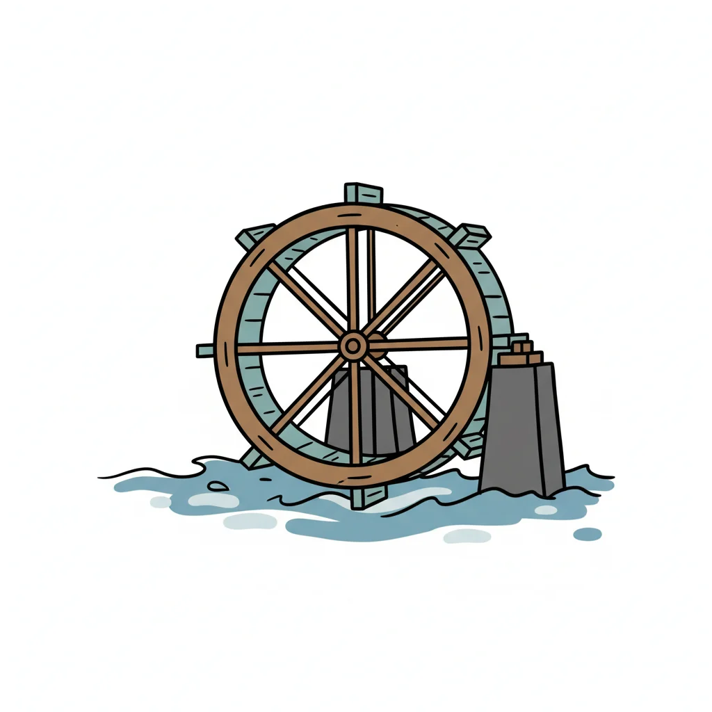 Holz-Wasserrad in blauem Wasser, gestützt von zwei grauen Pfeilern, im Cartoon-Stil.