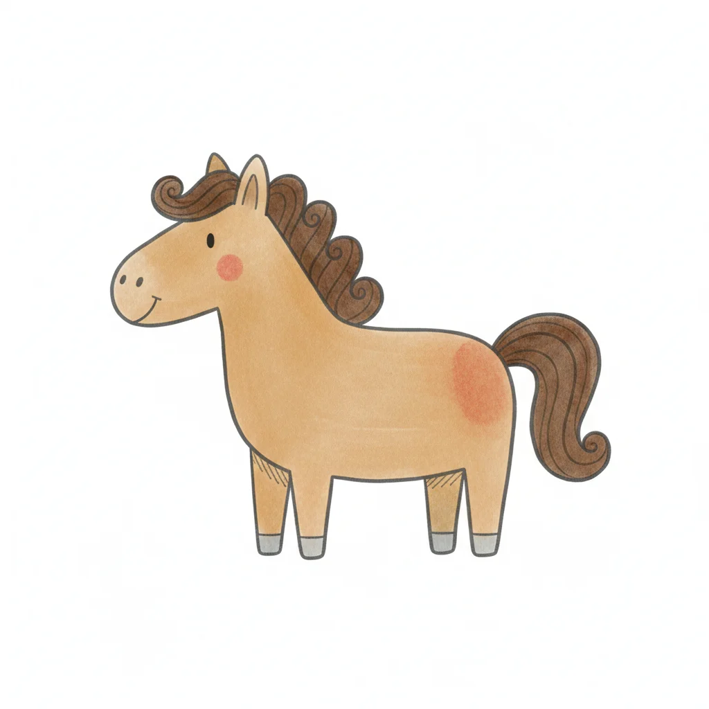 Niedliches, illustrierte Pferd mit lockiger Mähne in sanften Farben.