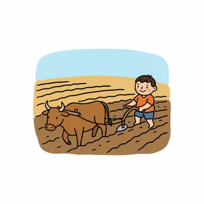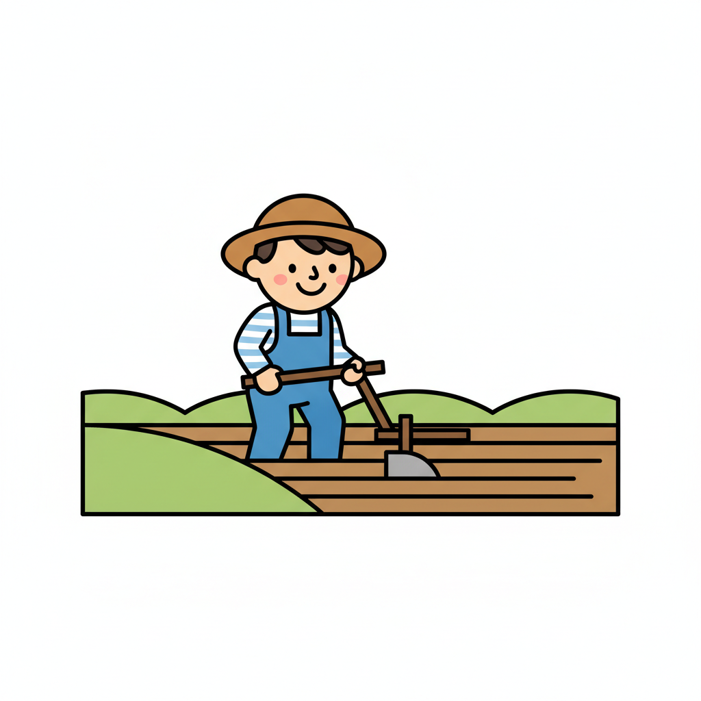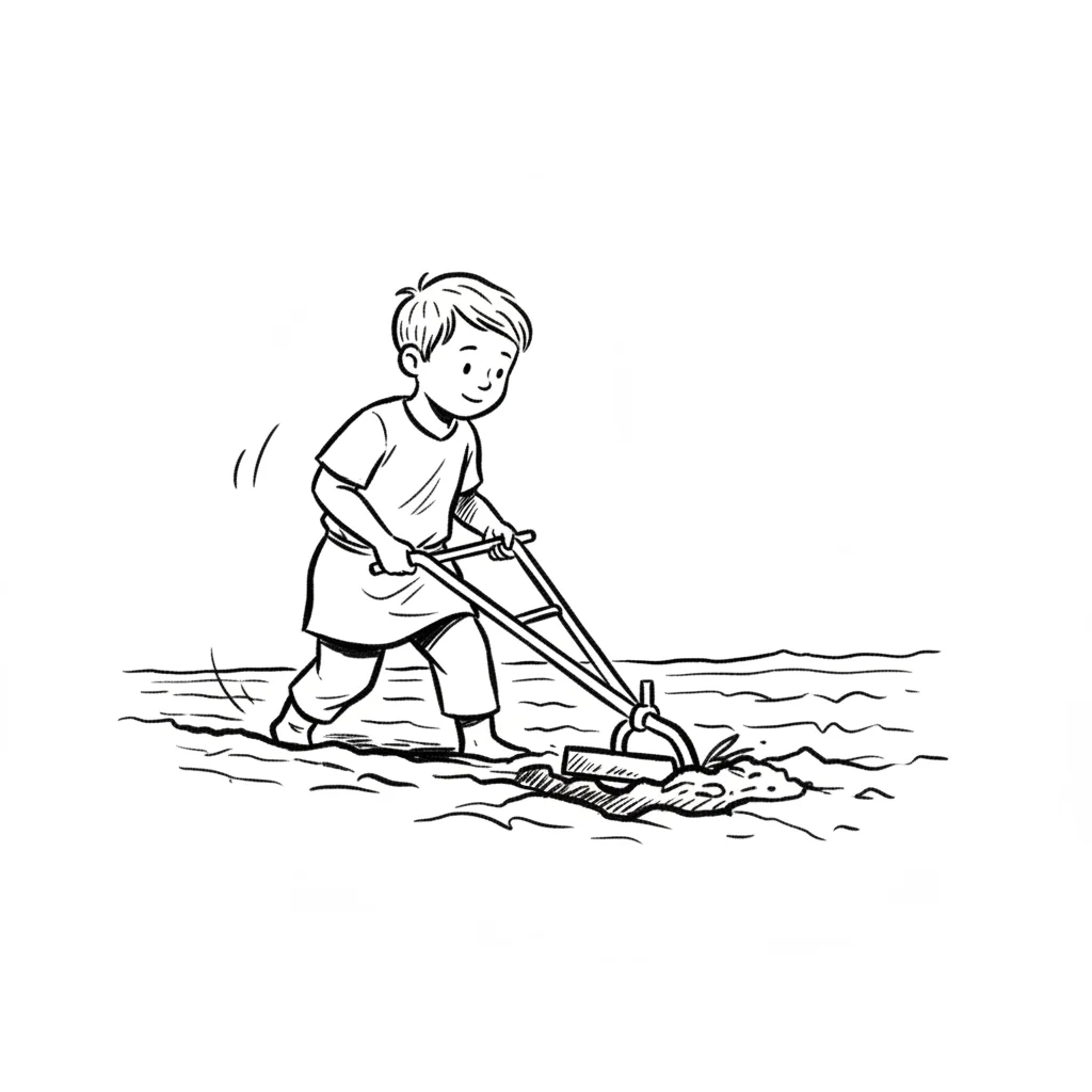 Cartoon eines lächelnden Jungen, der einen Handpflug auf einem Feld benutzt.