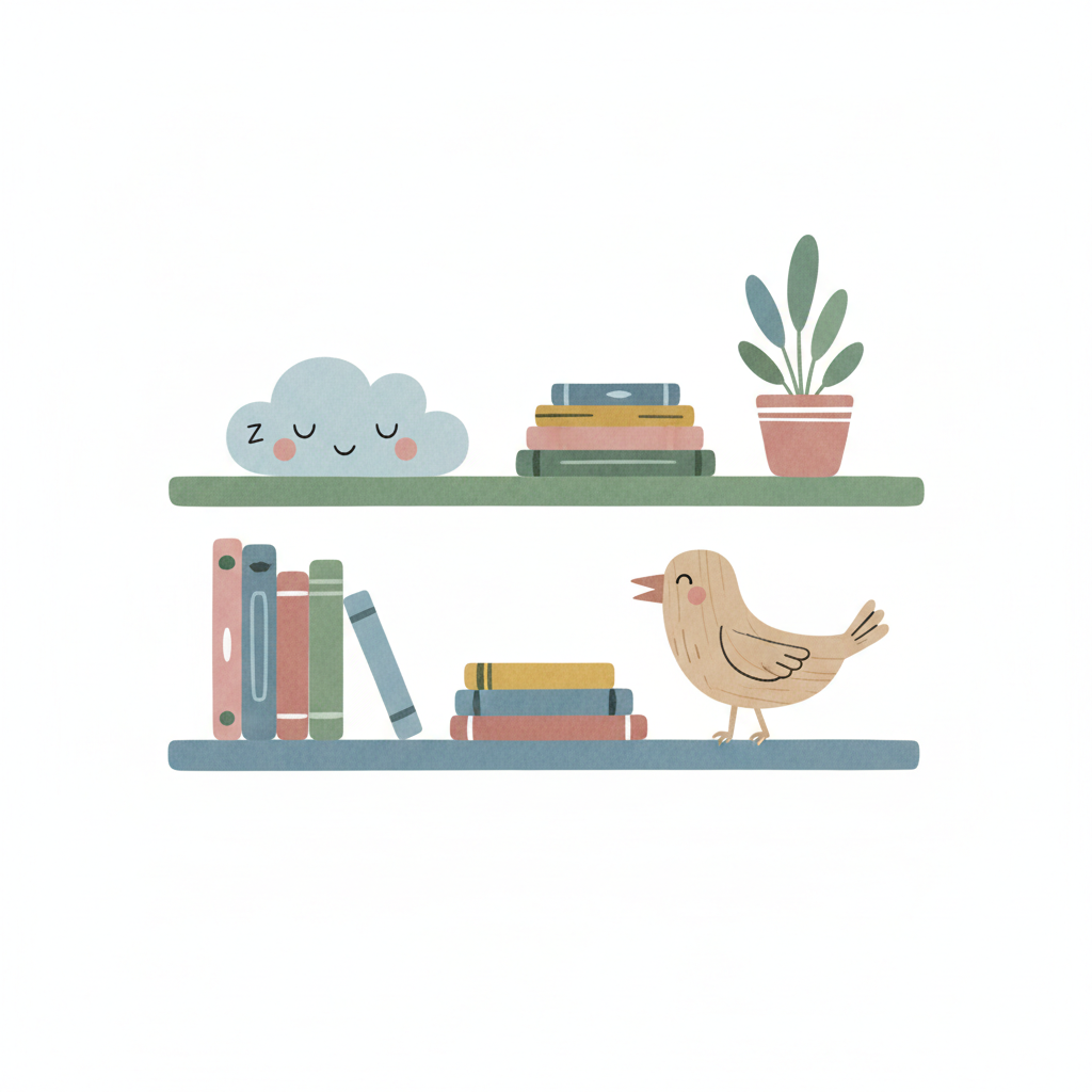Regal mit Büchern, einer Pflanze und einem Vogel unter einer Wolke.