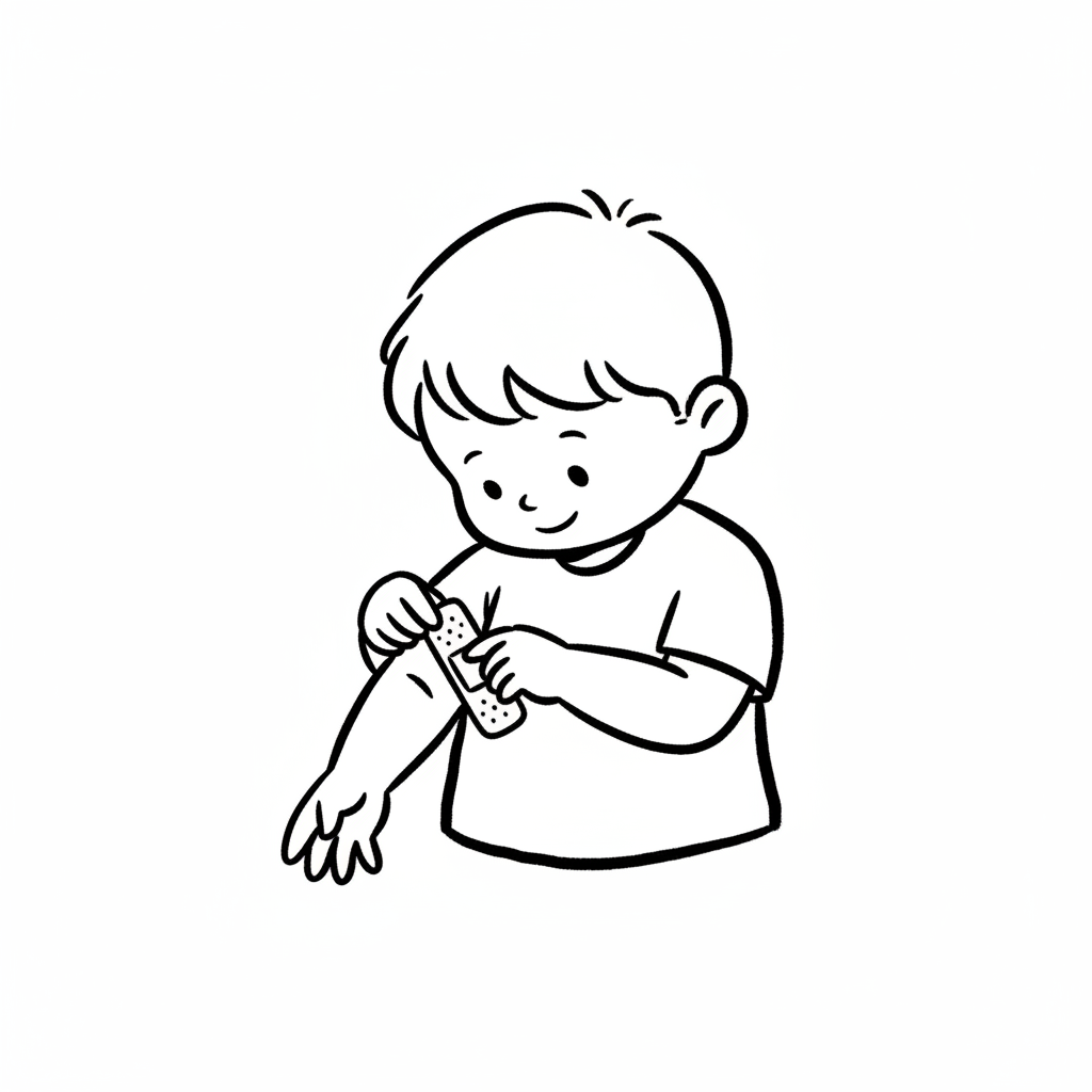 Ein Junge bringt sich ein Pflaster an seinem Arm an.