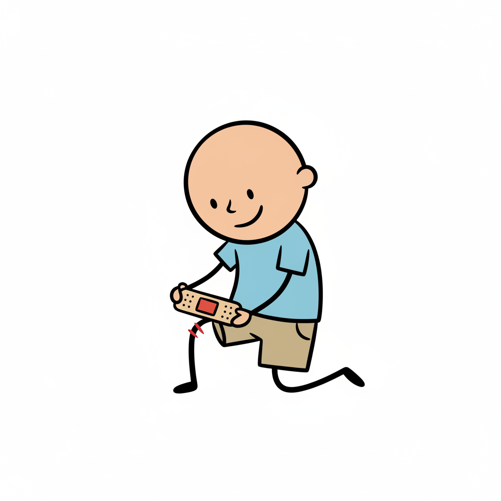Junge mit Pflaster am Knie, betrachtet seine Verletzung lächelnd.