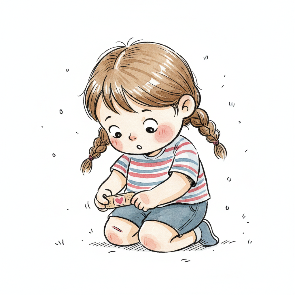 Ein kleines Mädchen spielt mit einem Pflaster auf dem Boden.