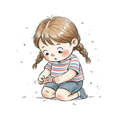 Niedliche, kindgerecht illustrierte Szene mit einem Kind oder einer Person als Hauptfigur, vor rein weißem Hintergrund, im frech-nordischen Aquarell-Skizzenstil. Klare, leicht wackelige Tuschekonturen, sichtbare Pinsel- und Strichtextur, dezente Schraffuren, weiche handgemalte Farbflächen in gedeckten Farben. Einfache, runde Formen. Keine harten Schatten, sondern sanfte, transparente Aquarellschichten. Leicht raue, handgezeichnete Linien statt glatter Vektorkanten. Subtile, vereinzelte Kritzelpunkte oder kleine Details im Hintergrund (wie Pünktchen oder feine Striche), aber keine echte Umgebung oder Landschaft. Die Figur ist mittig zentriert. Insgesamt charmant, humorvoll, warm und handgemacht wirkend. WICHTIG: Das Bild darf ABSOLUT KEINEN TEXT, KEINE BUCHSTABEN und KEINE ZAHLEN enthalten.