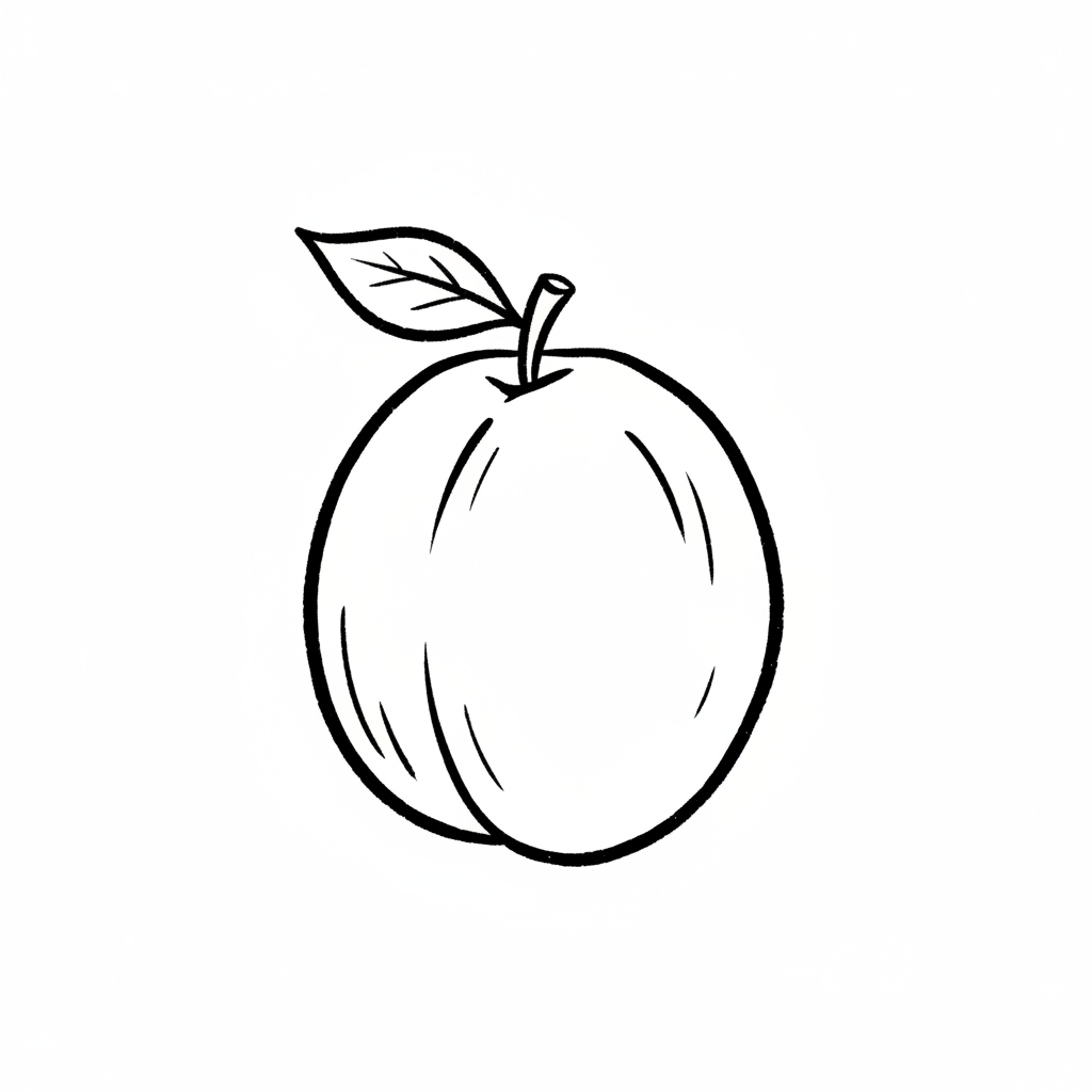 Ein einfaches, schwarz-weiß skizziertes Bild einer Frucht mit einem Blatt.