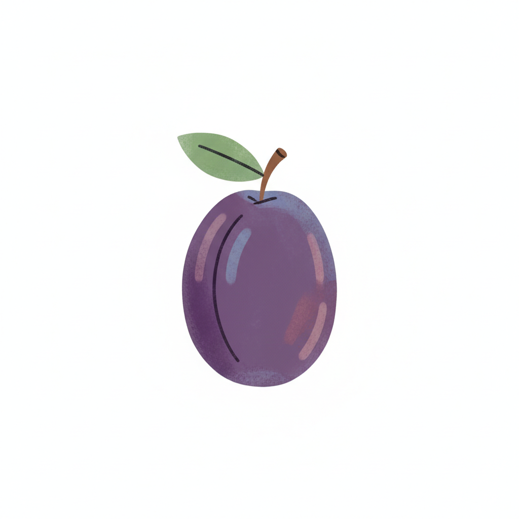 Eine stilisierte Pflaume mit einem grünen Blatt.