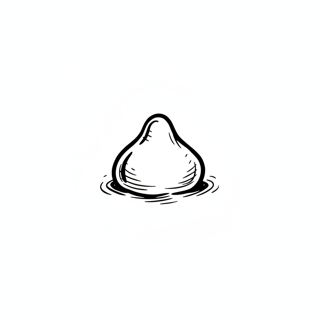 Schwarz-weiße Skizze eines stilisierten Schokoladenstücks oder Tropfens mit Wellen am Boden.