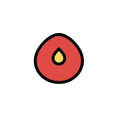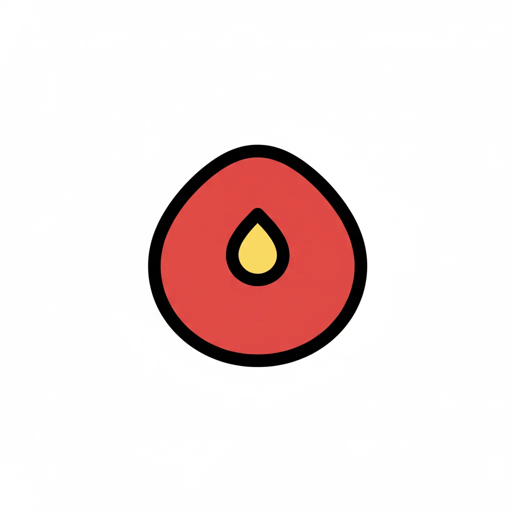 Minimalistisches Icon: Rotes Oval mit gelbem Tropfenkern, schwarze Umrandung auf weißem Grund.