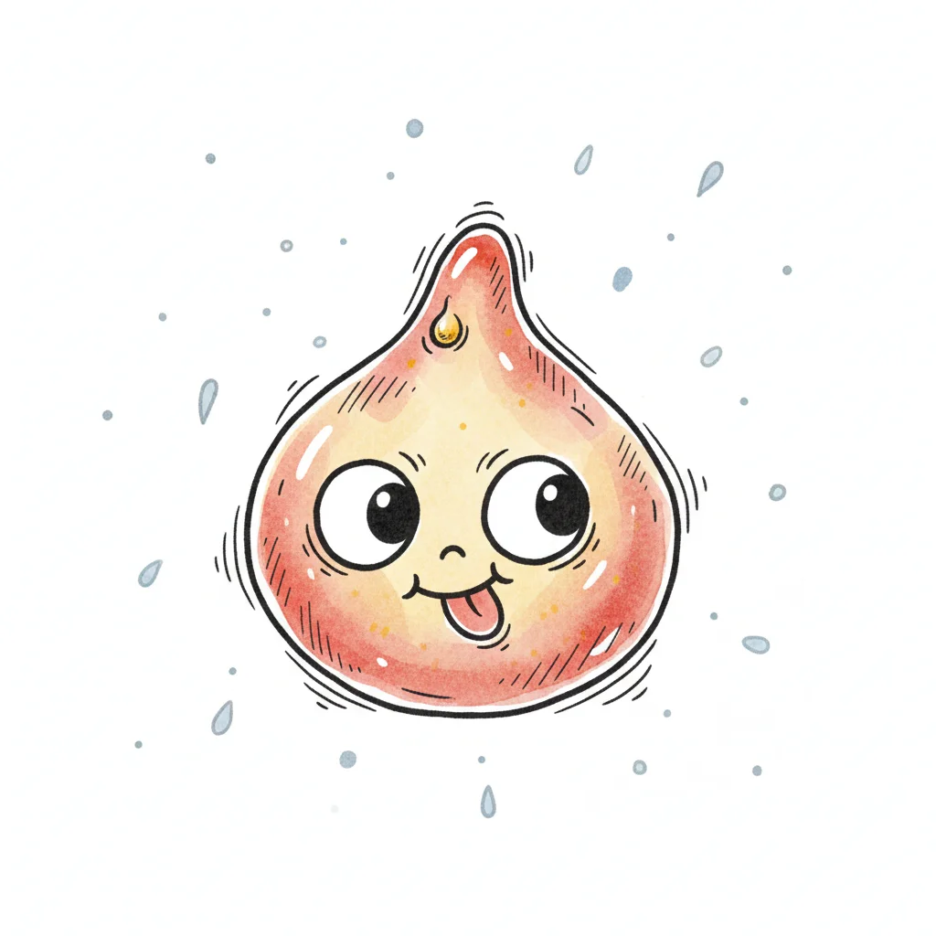 Lustige Cartoon-Zwiebel mit Zunge, umgeben von Wassertropfen, im Aquarellstil.
