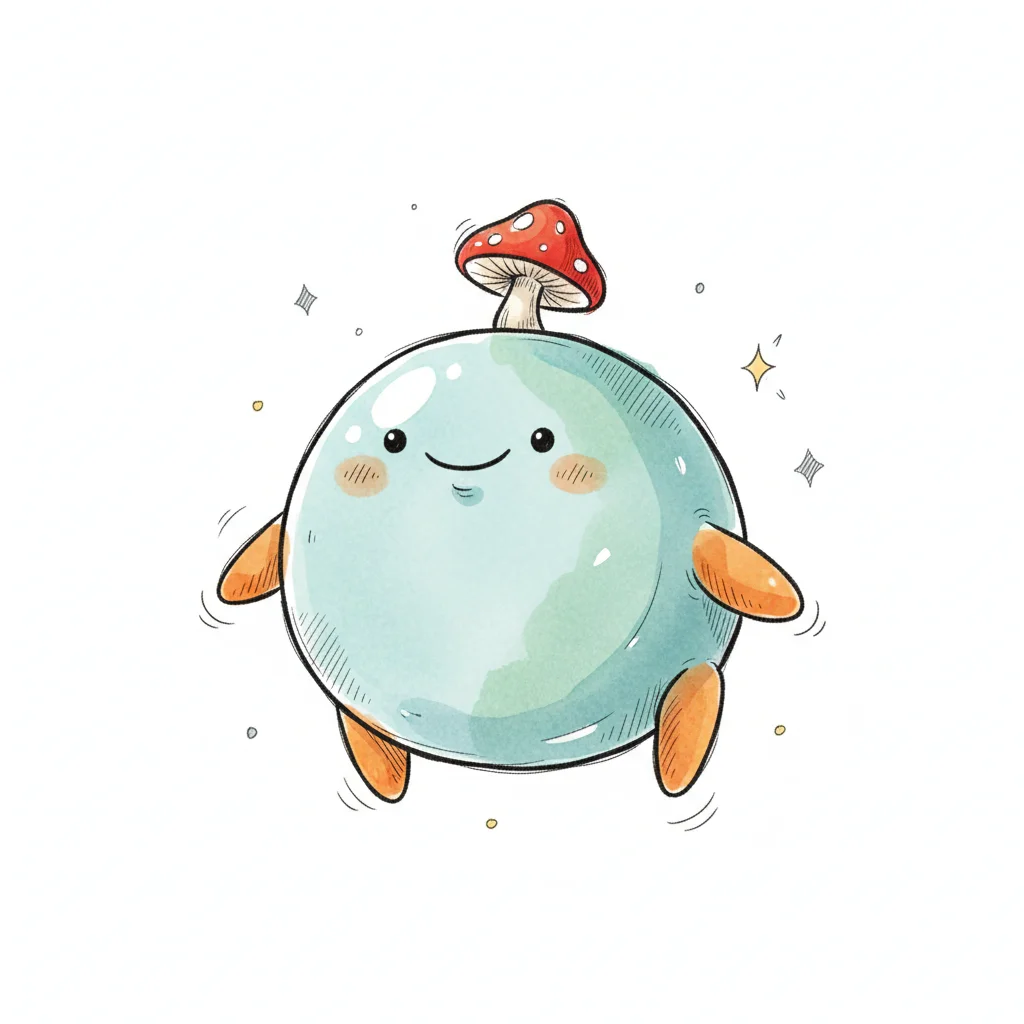 Niedliches, rundes, hellblaues Wesen mit Pilzhut und fröhlichem Gesicht, umgeben von Glitzer.