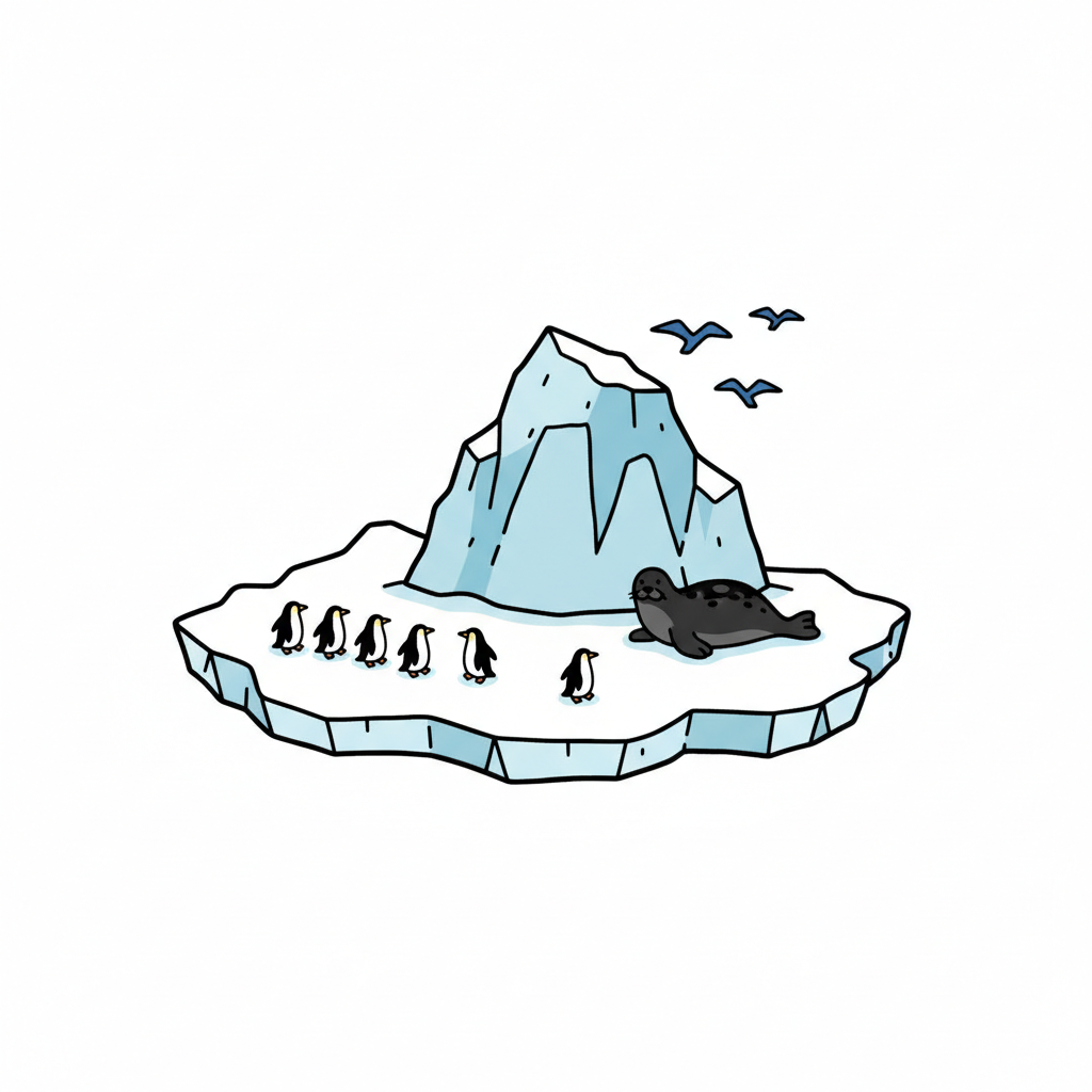 Cartoonbild von Pinguinen, einer Robbe und Vögeln auf einer Eisscholle mit einem Eisberg.