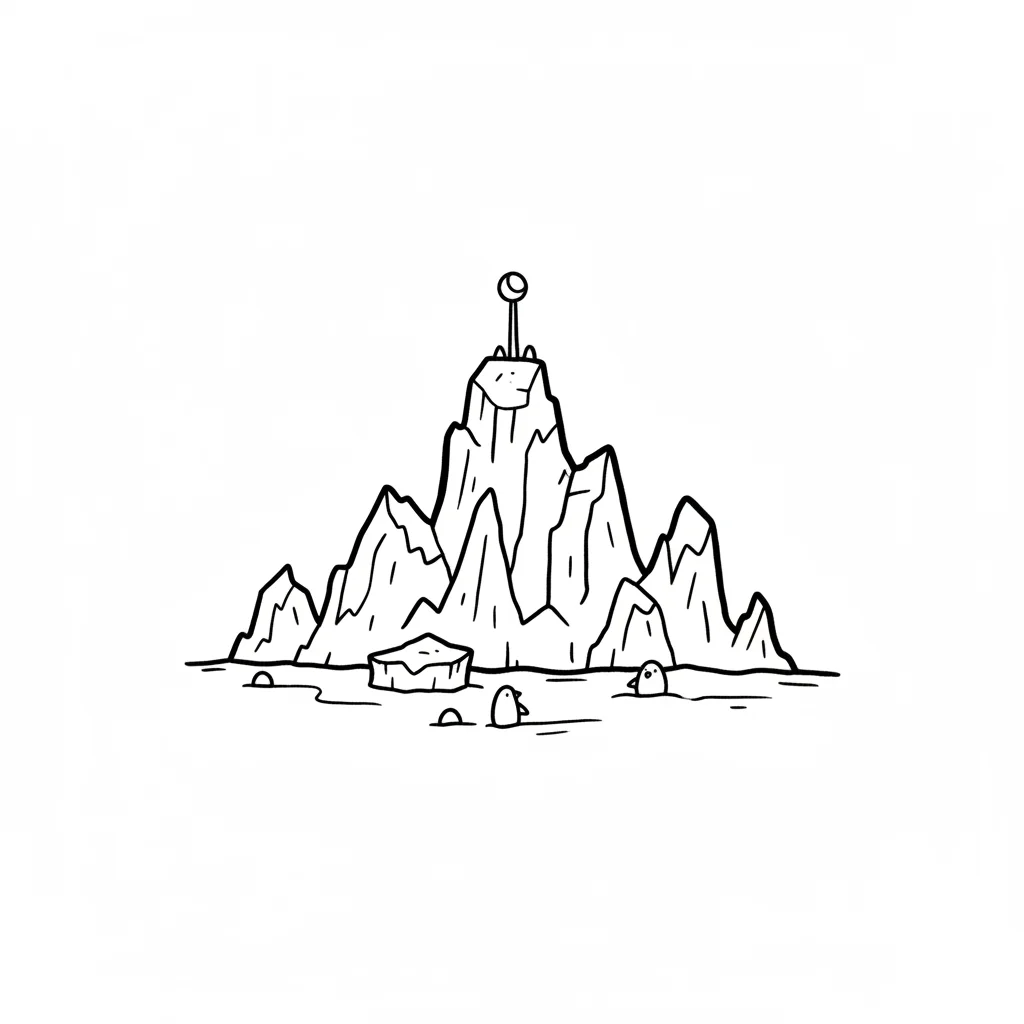Schwarz-weiße Zeichnung einer Eislandschaft mit Bergen, Pinguinen und einem Mondsymbol auf dem Gipfel.