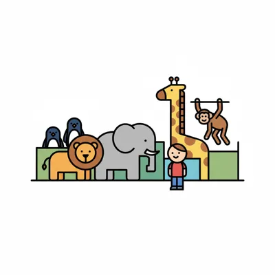 Ein Junge steht vor einer Reihe von Zootieren: Löwe, Pinguine, Elefant, Giraffe, Affe in Cartoon-Stil.