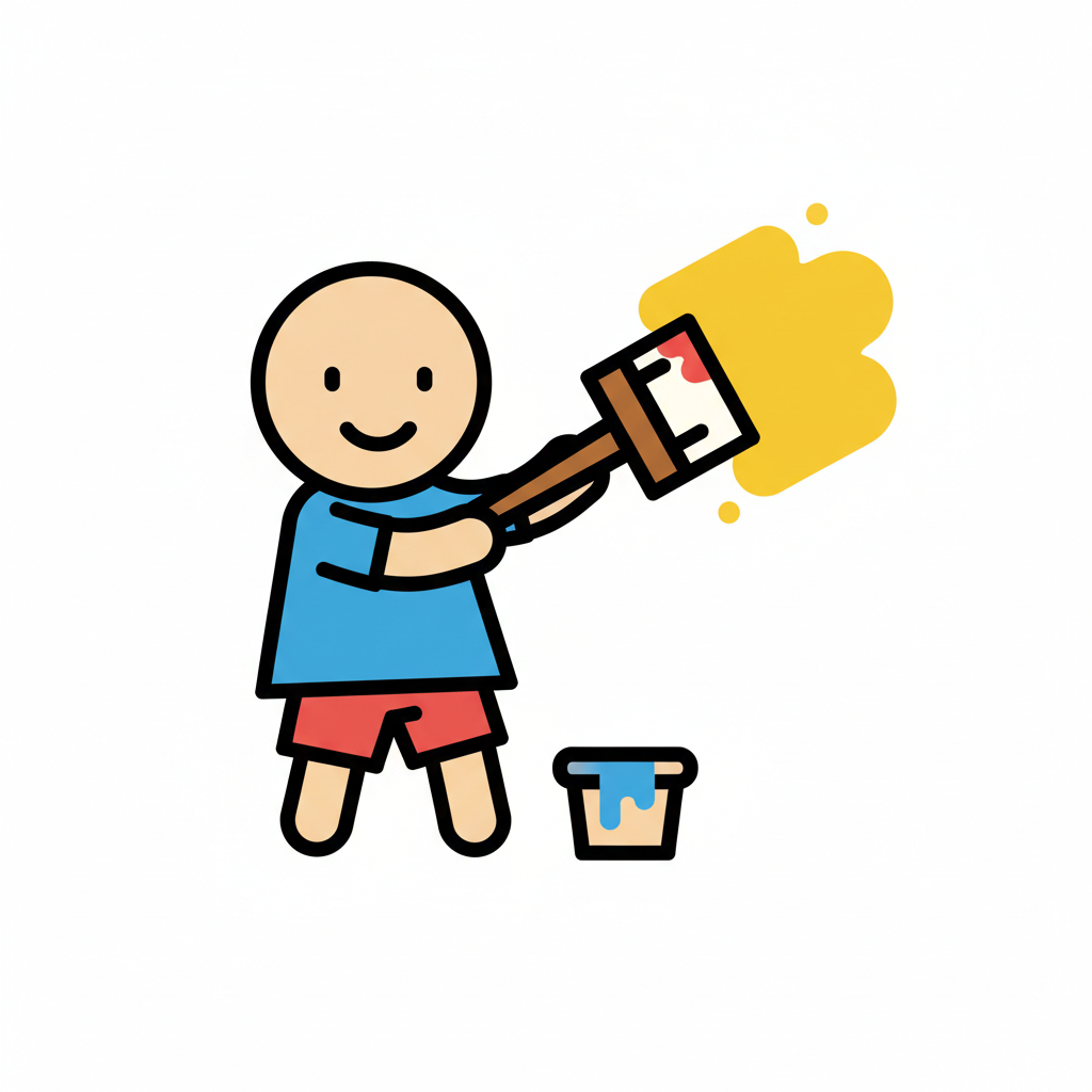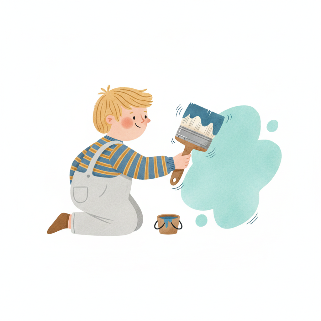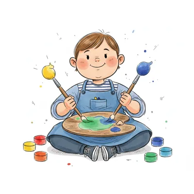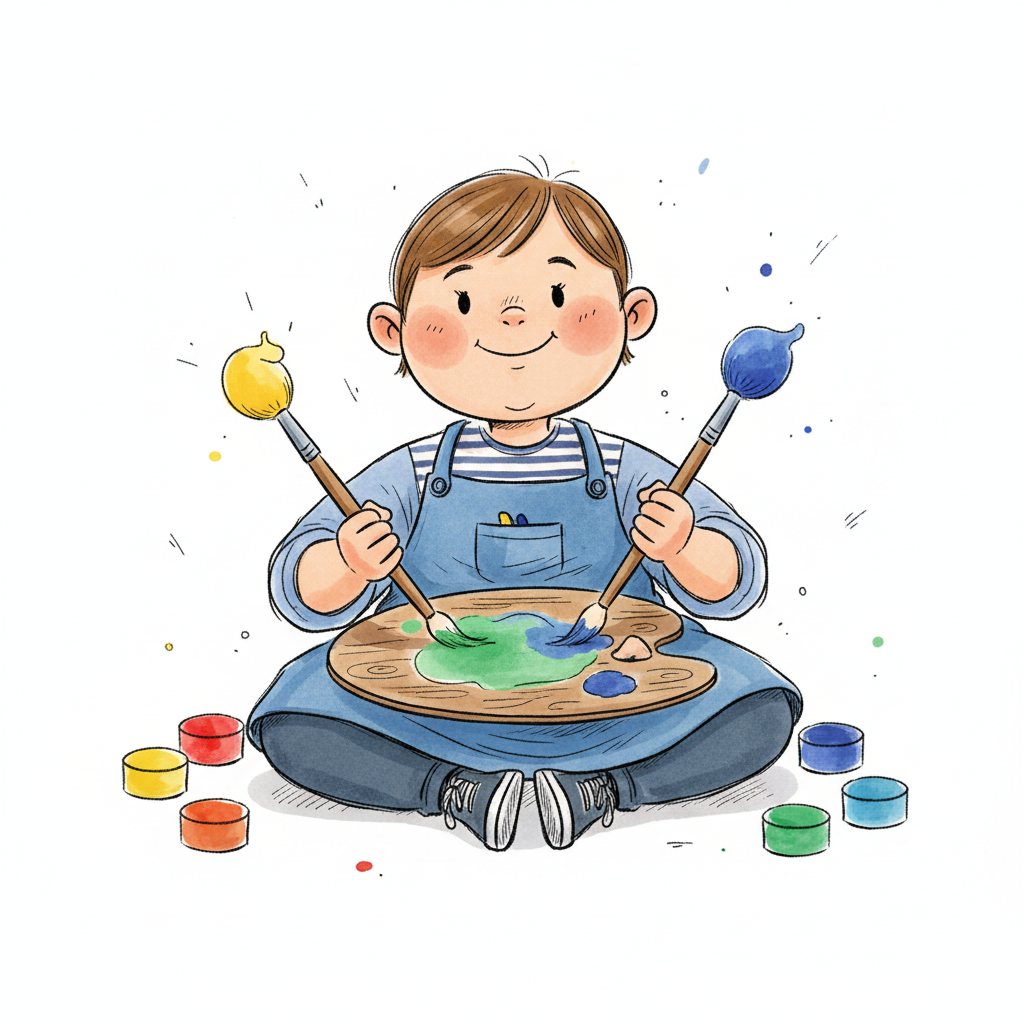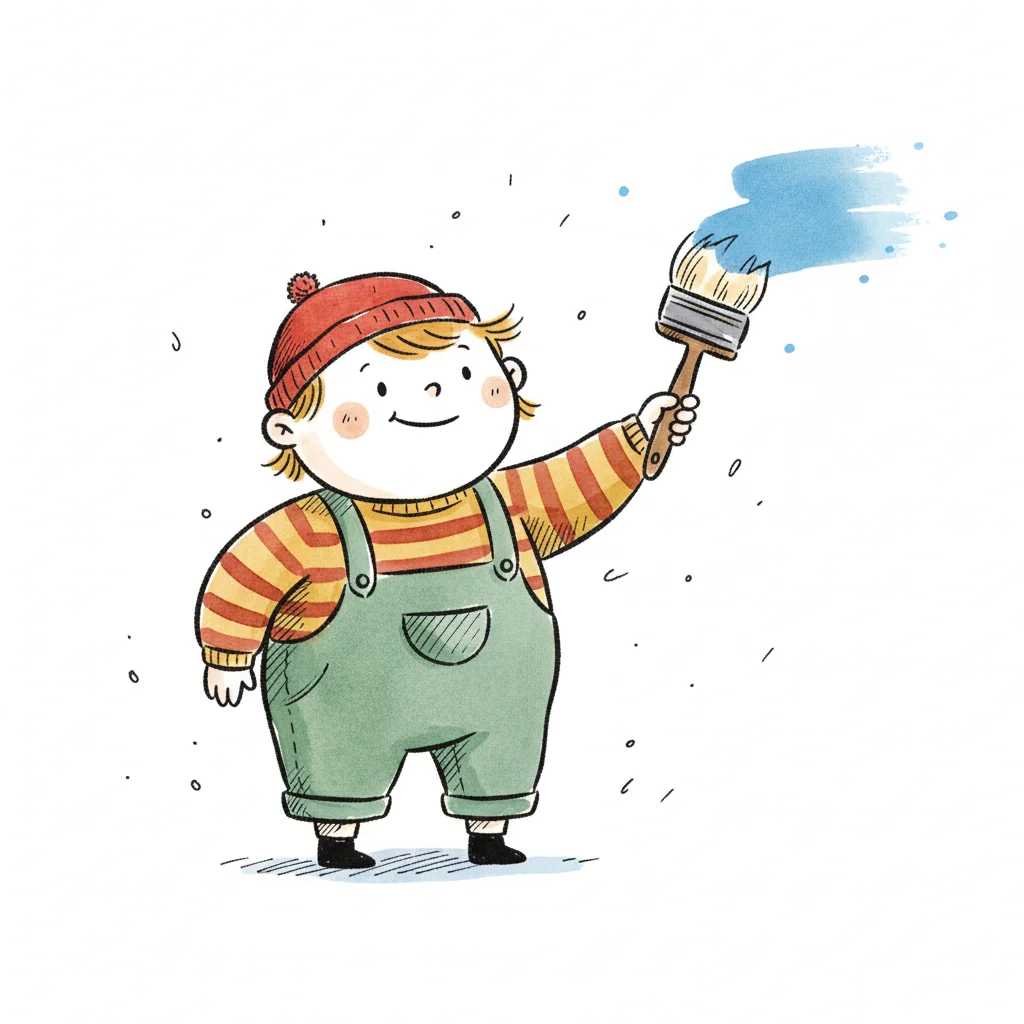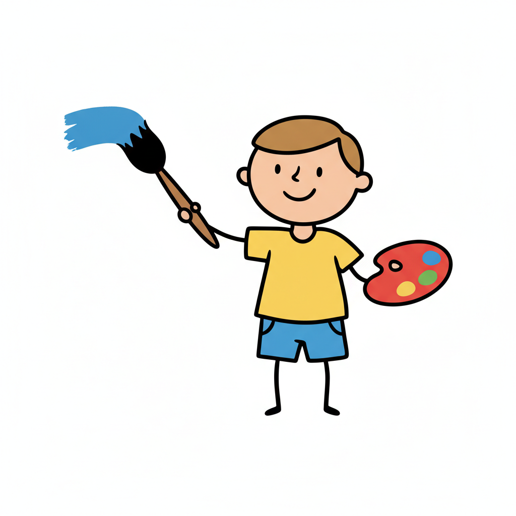 Ein lächelnder Cartoon-Junge malt mit Pinsel und Palette. Er trägt ein gelbes Shirt und blaue Shorts.