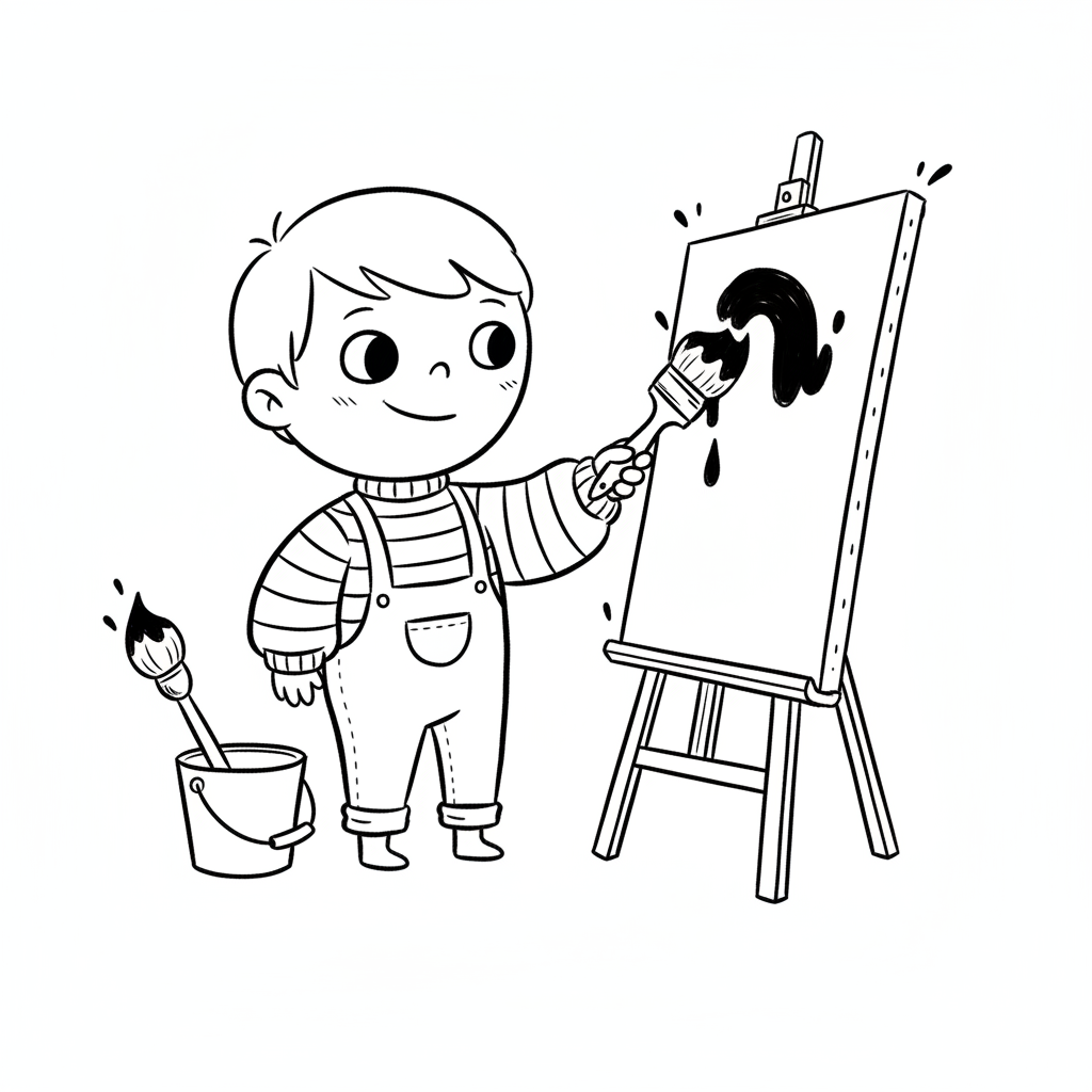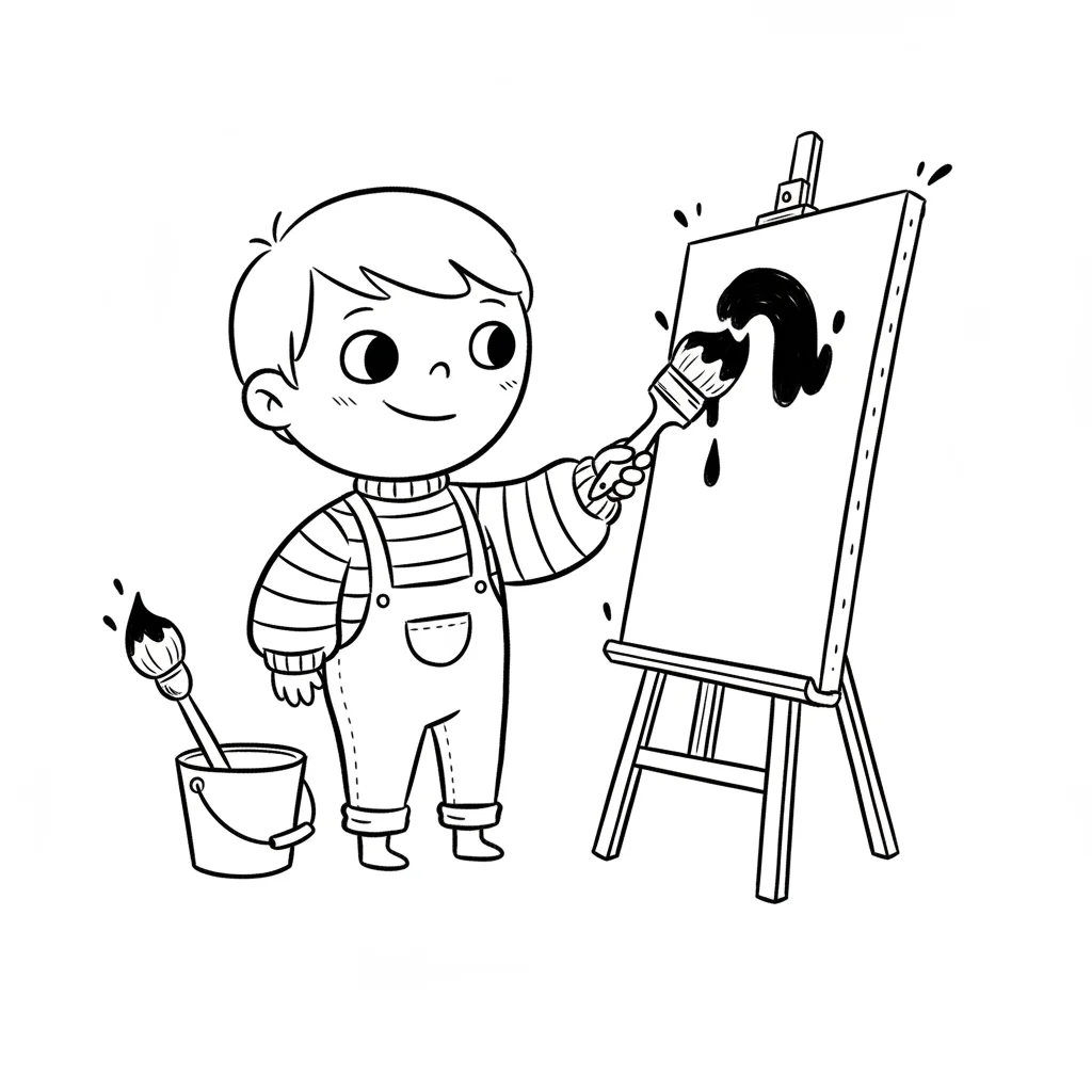 Niedlicher Cartoon-Junge malt mit Pinsel und schwarzer Farbe auf einer Staffelei. Malbuch-Stil.