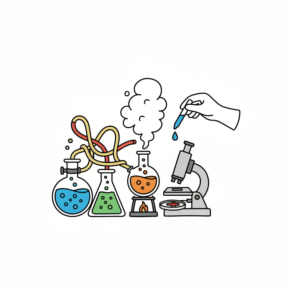 Bunte Illustration von Laborgeräten: Reagenzgläser, Mikroskop, Pipette und ein Experiment.