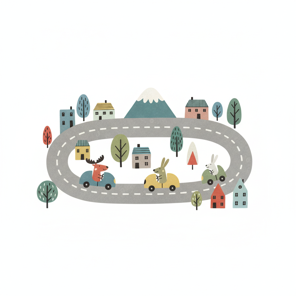 Niedliche Cartoon-Szene: Tiere fahren Autos auf einer Straße, umgeben von Häusern, Bäumen und Bergen.