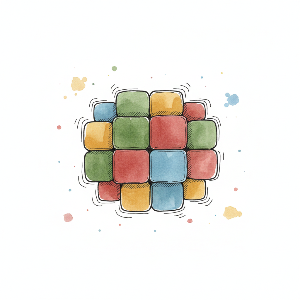 Aquarell-Illustration von bunten, abgerundeten Würfeln mit skizzierten Konturen und Farbspritzern.