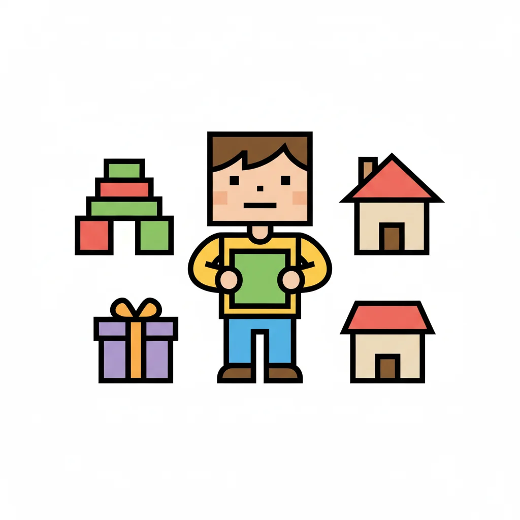 Pixel-Charakter mit Bausteinen, Geschenk und Häusern, symbolisiert Kindheit und Bauen.