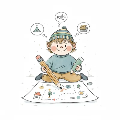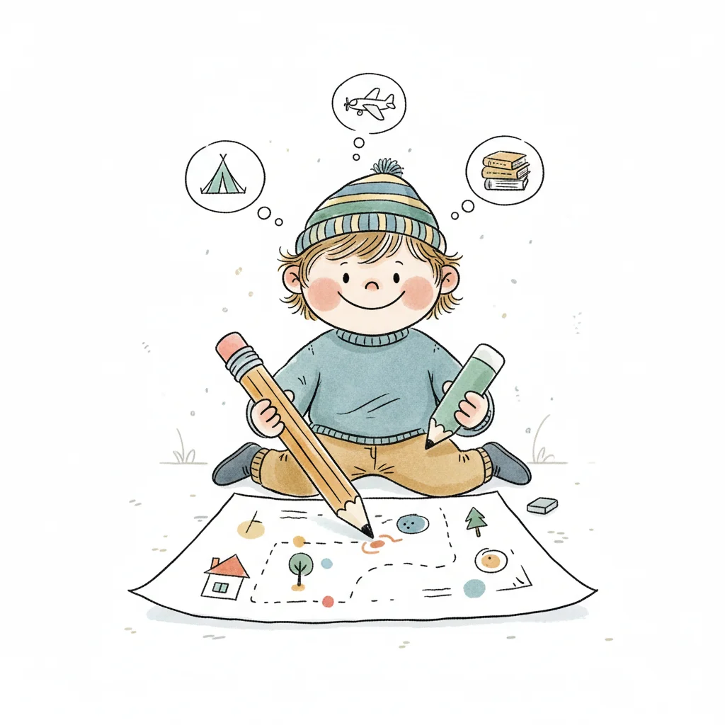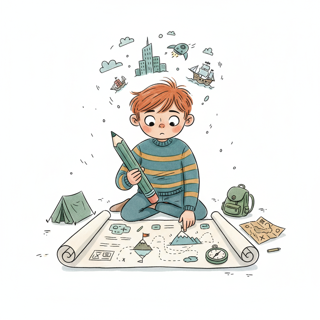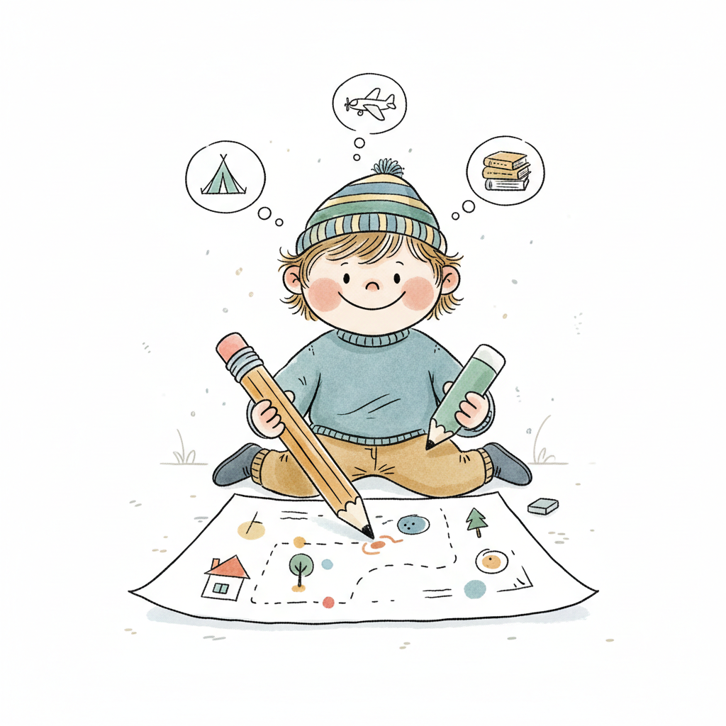 Ein lächelndes Kind zeichnet eine Abenteuerkarte und träumt von Zelten, Flugzeugen und Büchern.