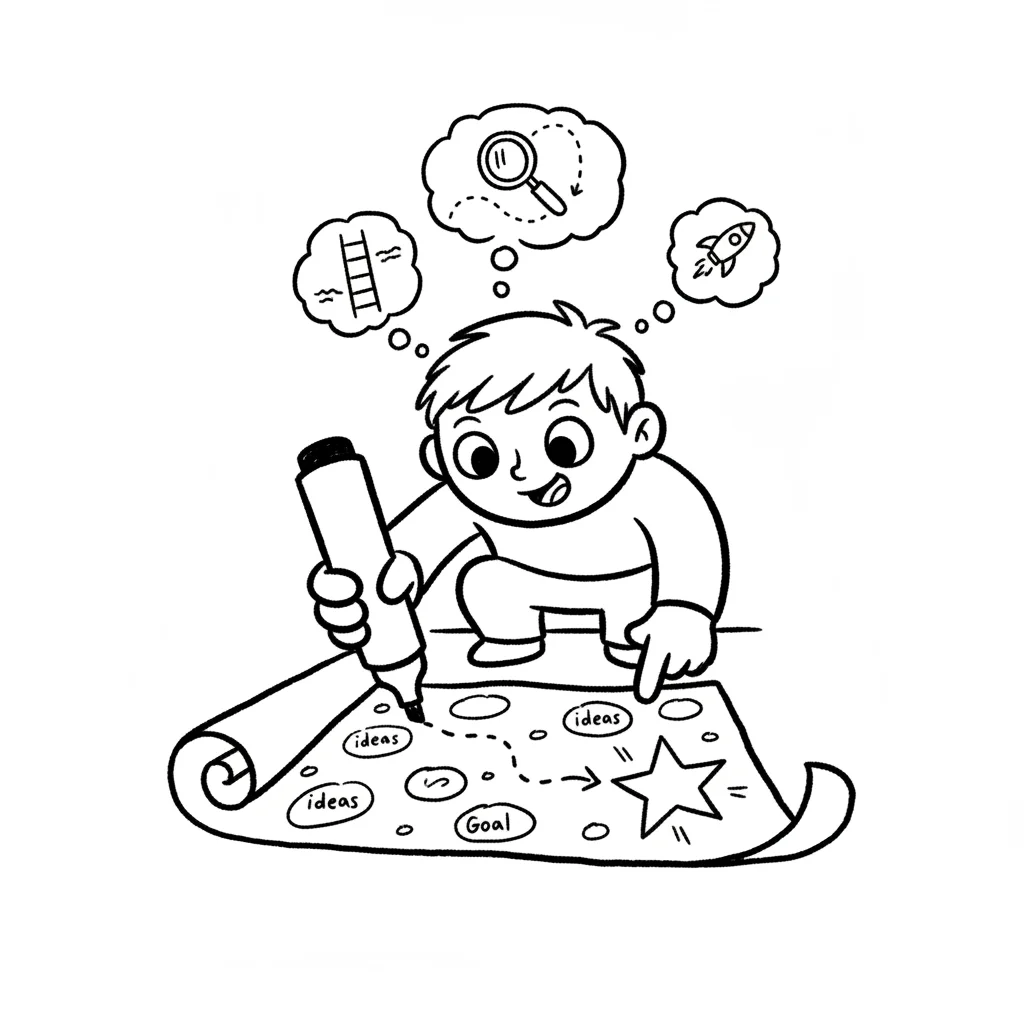 Kind zeichnet Mindmap mit Ideen, Zahnrad und Zielsymbolen auf Papier.