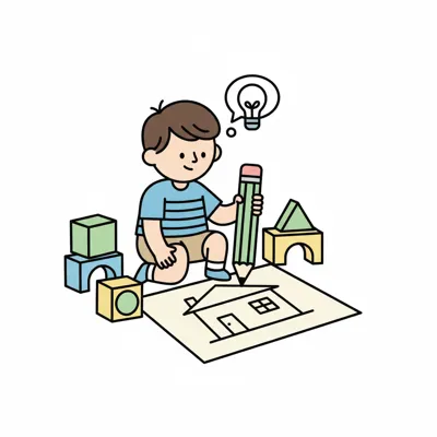 Ein Junge zeichnet ein Haus mit einem Bleistift, umgeben von Bauklötzen, mit einer Glühbirne für Ideen.