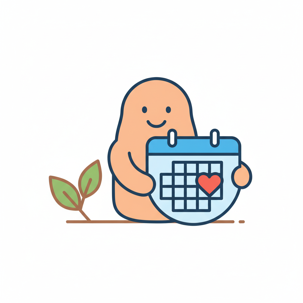 Glückliche Kartoffel-Figur hält Kalender mit Herz, daneben wachsen Blätter. Terminplanung.