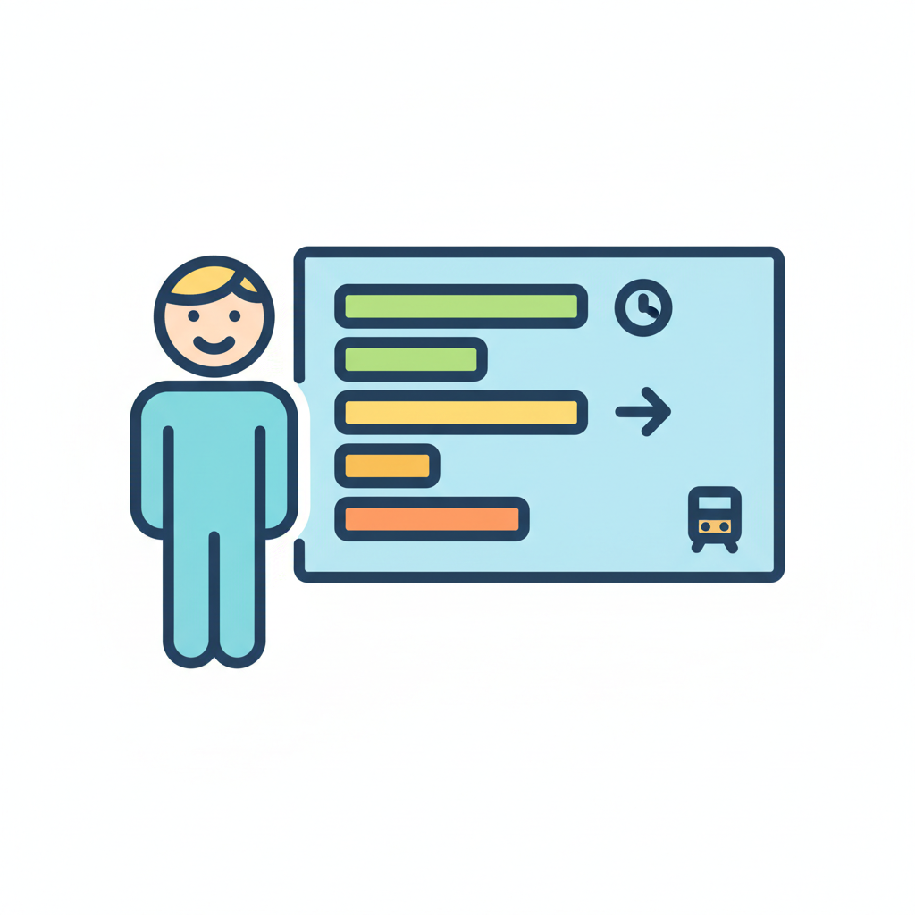 Icon einer Person, die einen Zeitplan mit Fortschrittsbalken, Uhr und Bus darstellt.