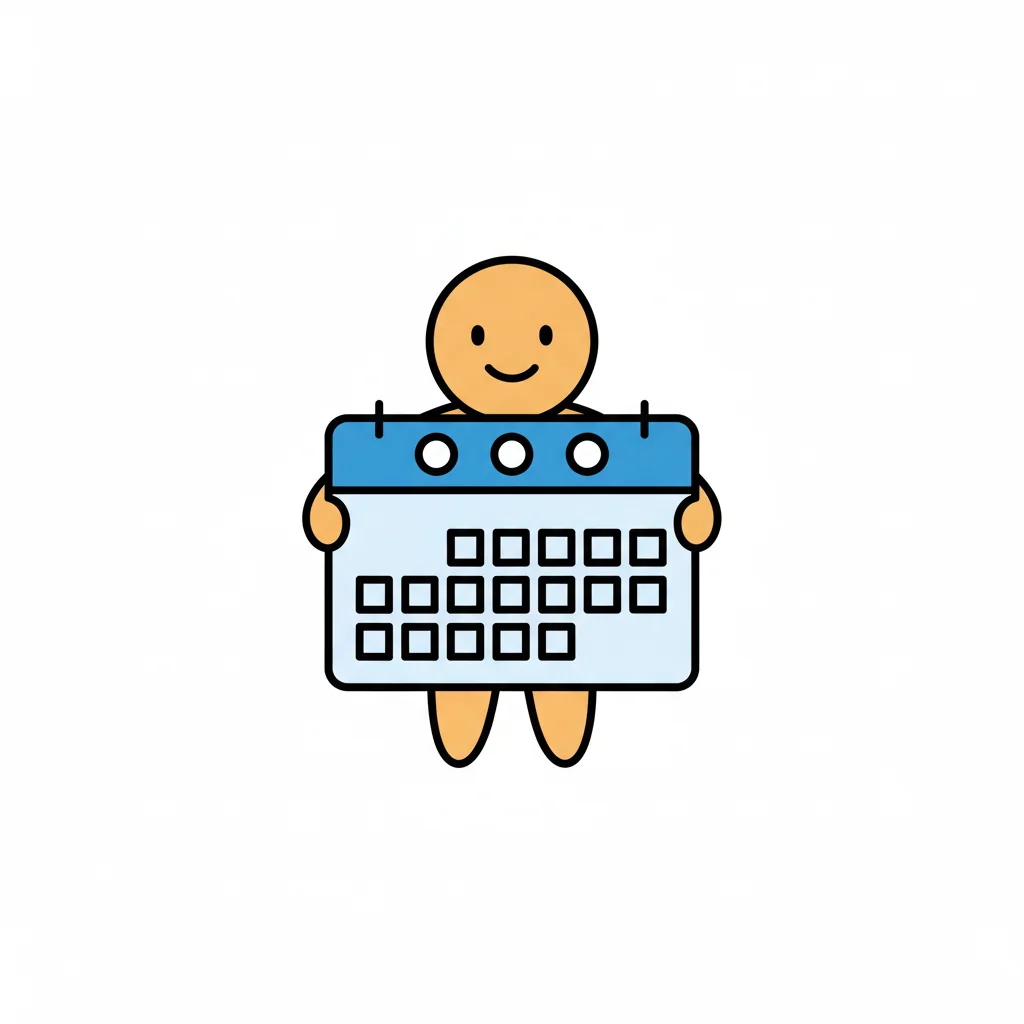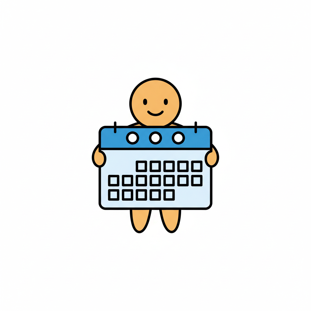 Ein lächelnder Cartoon-Charakter hält einen blauen Kalender mit leeren Tagesfeldern.