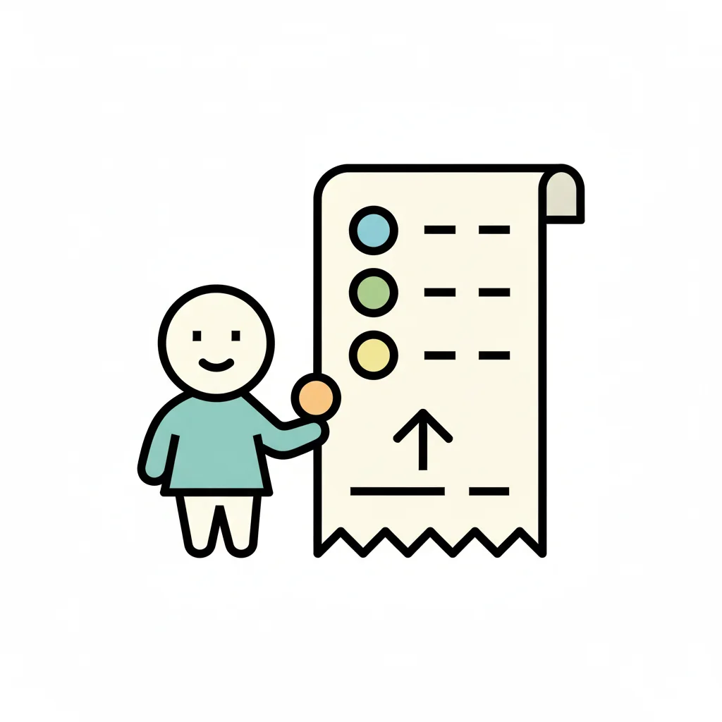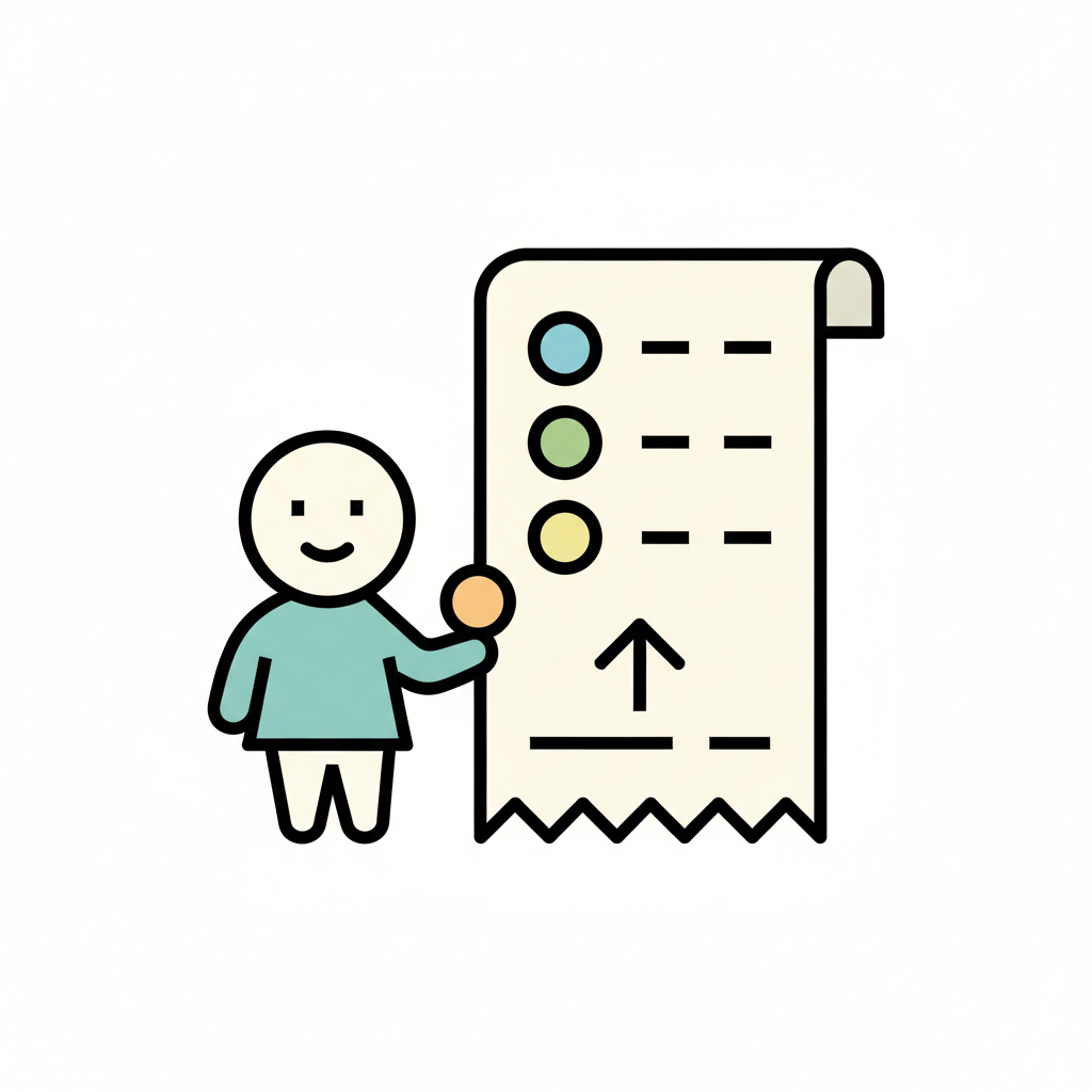 Ein lächelndes Strichmännchen steht vor einer langen Liste mit farbigen Punkten und einem Pfeil.