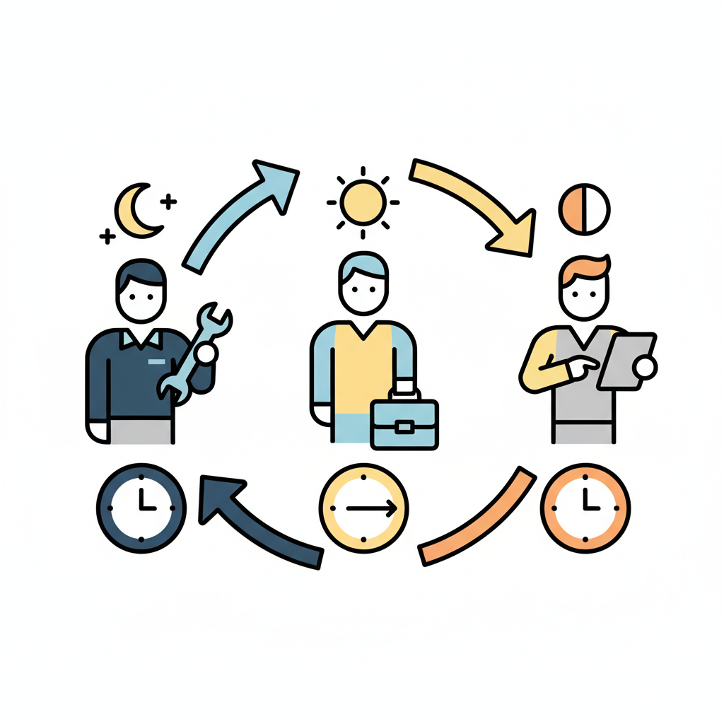 Arbeitszyklus mit drei Phasen: Nachtschicht, Tagarbeit und Planung, symbolisiert durch Personen und Uhren.
