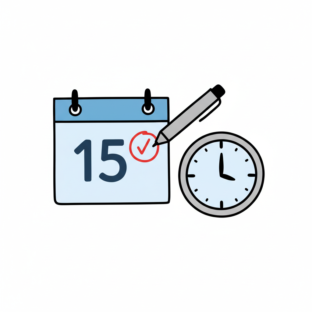 Kalender mit dem 15., Haken, Stift und Uhr symbolisieren Terminplanung und Zeitmanagement.