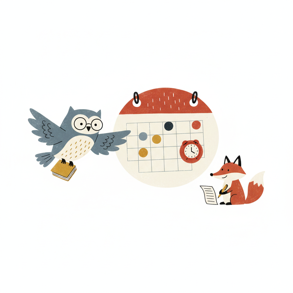 Cartoon-Eule mit Buch, Fuchs schreibend und Kalender. Symbolisiert Planung und Lernen.