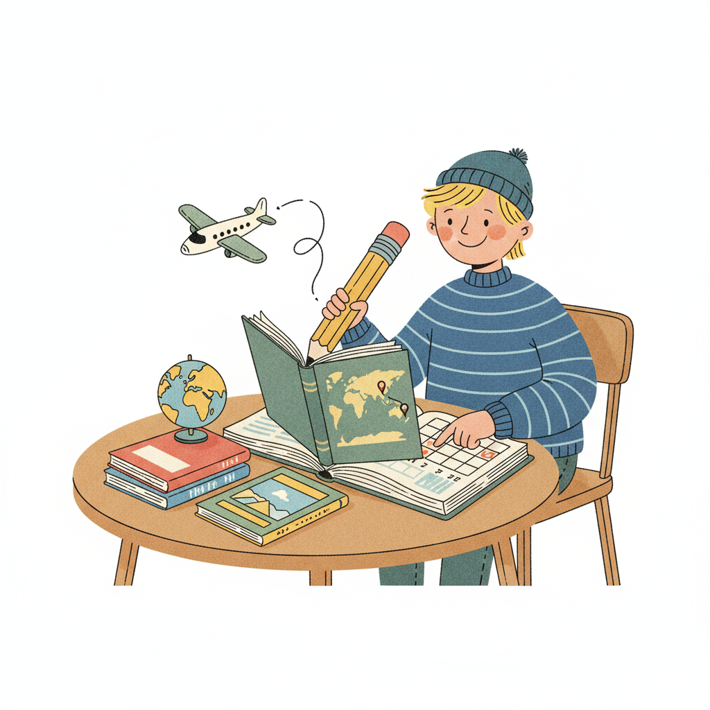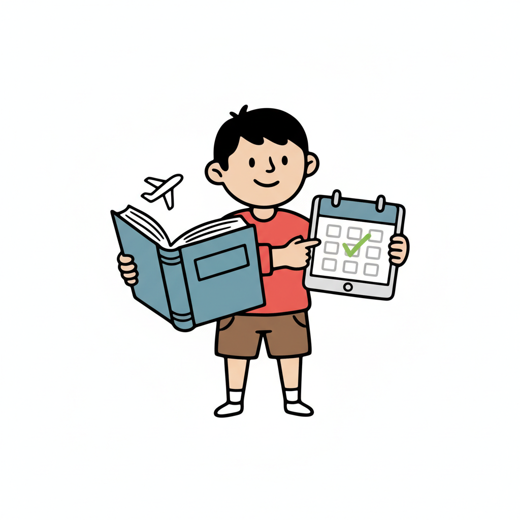 Kind plant Reise: liest Buch, zeigt auf Kalender mit grünem Haken und Flugzeugsymbol.