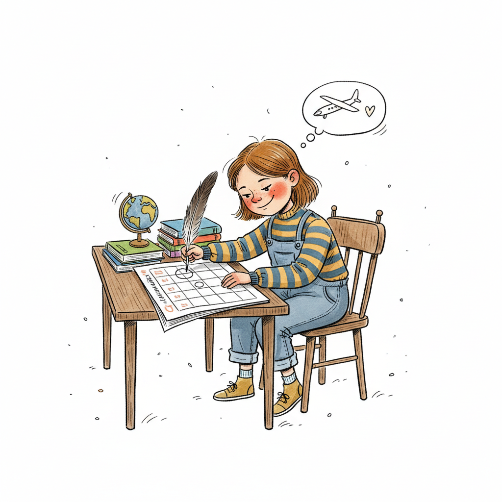 Mädchen plant Reise auf Kalender mit Federkiel, träumt von Flugzeug und Abenteuer.