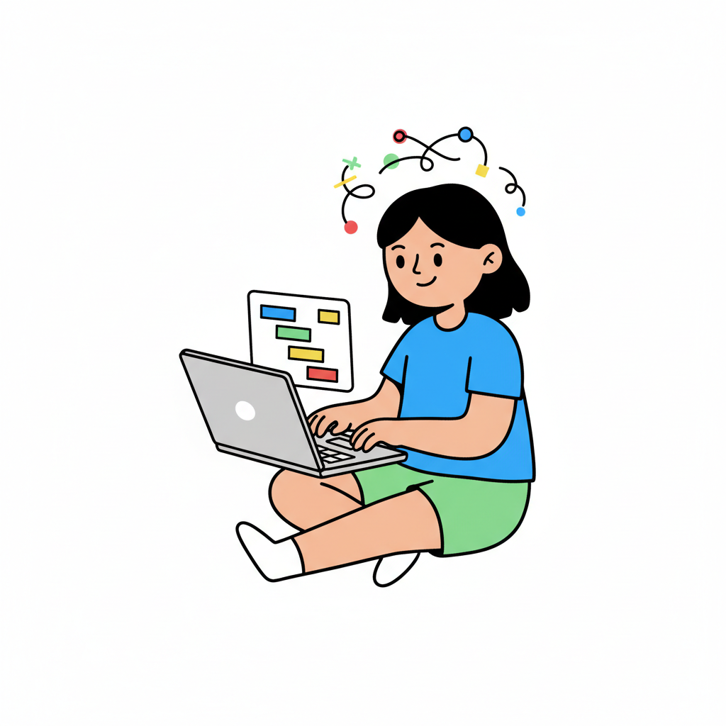 Cartoonfigur sitzt mit Laptop, plant Projekte und hat kreative Ideen.