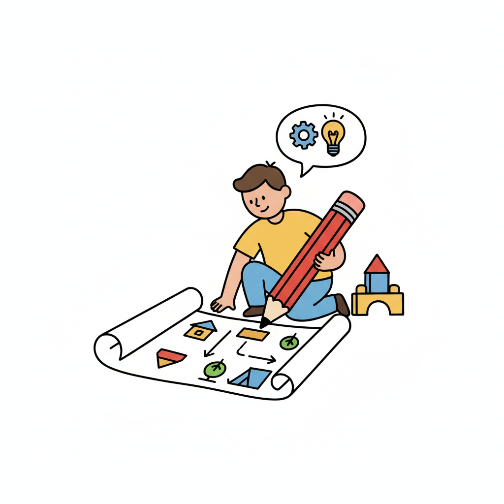Kind zeichnet Mindmap mit Ideen, Zahnrad und Zielsymbolen auf Papier.